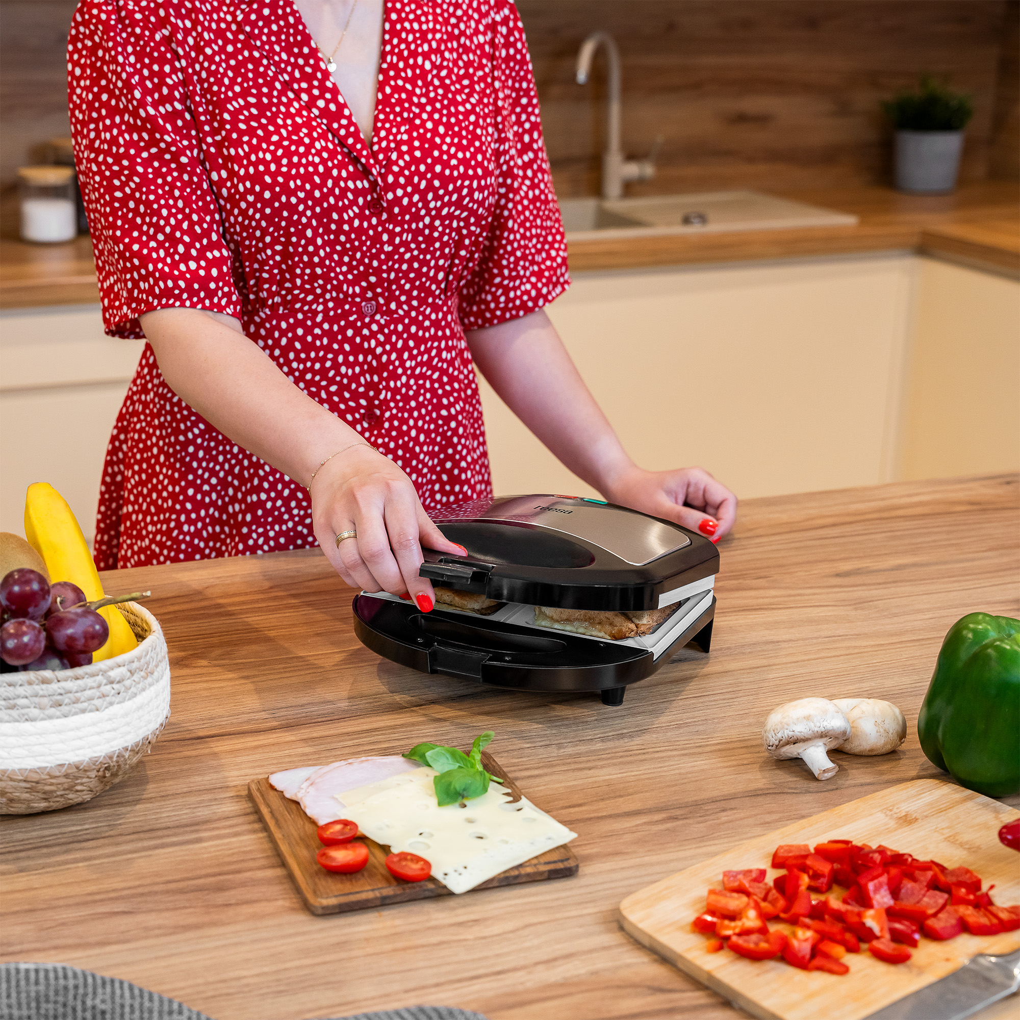 Čas je za spremembo! Za to je popoln aparat za sendviče Teesa TSA3222, ki vam omogoča preprosto pripravo okusnih prigrizkov. Visoka moč 800 W pomeni, da se naprava segreje v trenutku, tako da lahko hitro pripravite zajtrk za vso družino. Poleg tega je toaster opremljen s keramično prevlečenimi ploščami proti prijemanju, tako da ste lahko prepričani, da ne boste izgubljali časa z dolgočasnim čiščenjem.