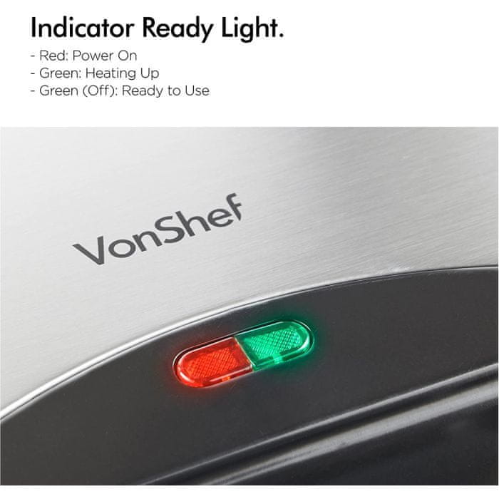 • VonShefov dvojni aparat za belgijske vaflje iz nerjavečega jekla vam omogoča, da svojim jutrom dodate kanček razkošja in v nekaj minutah pripravite dva okusna belgijska vaflja, pečena točno po vaših željah.