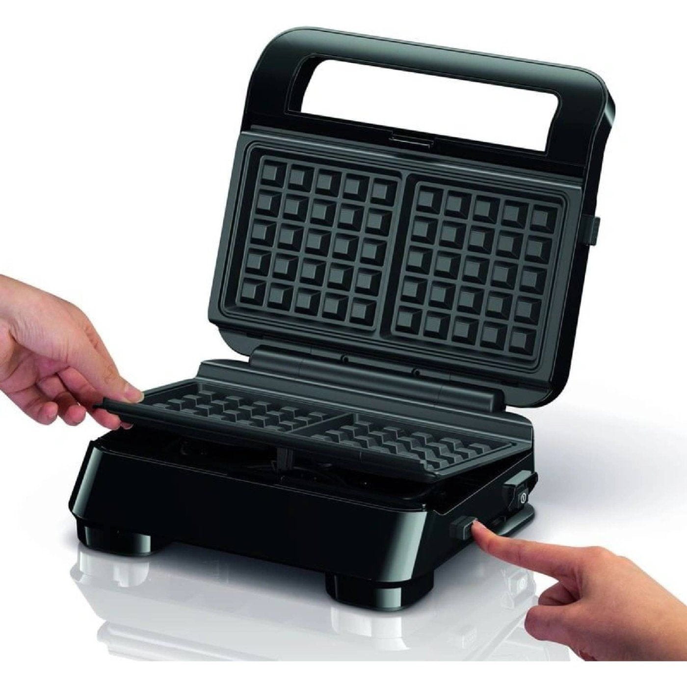 Multifunkcijski opekač kruha Braun SnackMaker 5 2 v 1 ponuja 2 kompleta enostavno odstranljivih plošč. En komplet vključuje dve grelni plošči za pripravo toastov ali popolnih trikotnih sendvičev. Drugi sklop grelnih plošč omogoča pripravo okusnih, puhastih vafljev. V kombinaciji z 800 W moči lahko hrano pripravite v nekaj trenutkih.