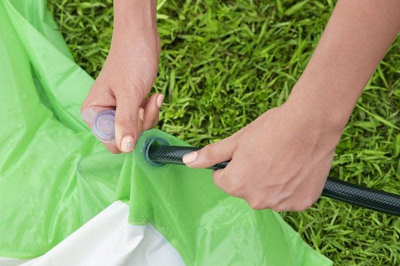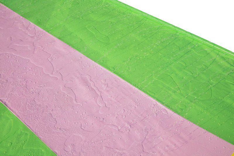 Priključek na vrtno cev. Napihljiv tobogan „SPEED RAMP“ – mehak napihljiv tobogan. Na toboganu so nameščeni vodni curki, ki nenehno zalivajo obe stezi, kar omogoča odličen tobogan.