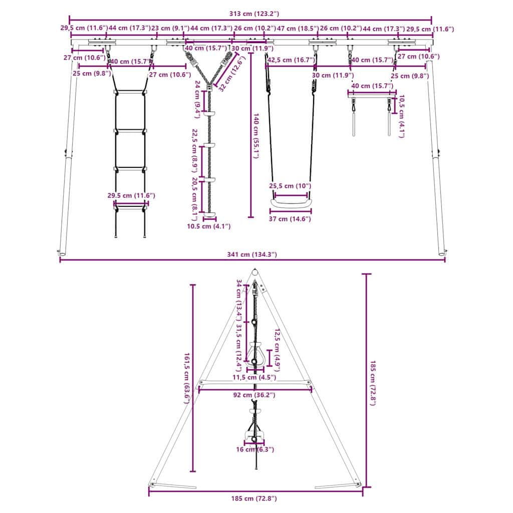 • Zabaven center za dejavnosti: Ta otroška gugalnica ponuja 4 različne možnosti igranja – dva gugalna sedeža, gugalnico iz vrvi s stopničkami, plezalno lestev in trapez s telovadnimi obroči. T