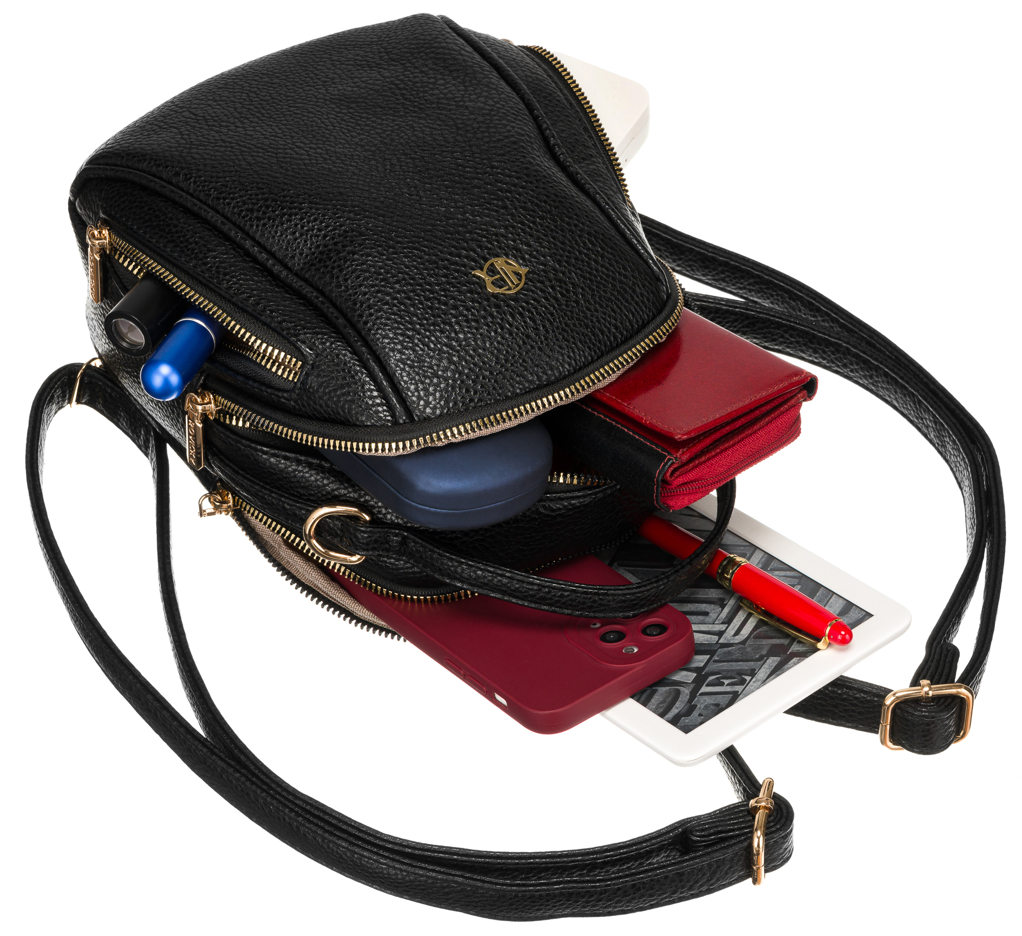 Nahrbtnik ima 2 klasična prostorna predala, ki se zapirajo z močno zadrgo. Zadnji predal ima 1️⃣ dodatni odprti žep . Kljub majhnosti ta model zlahka pospravi vaš telefon, denarnico, ključe, kozmetiko, parfum, očala in druge potrebščine.