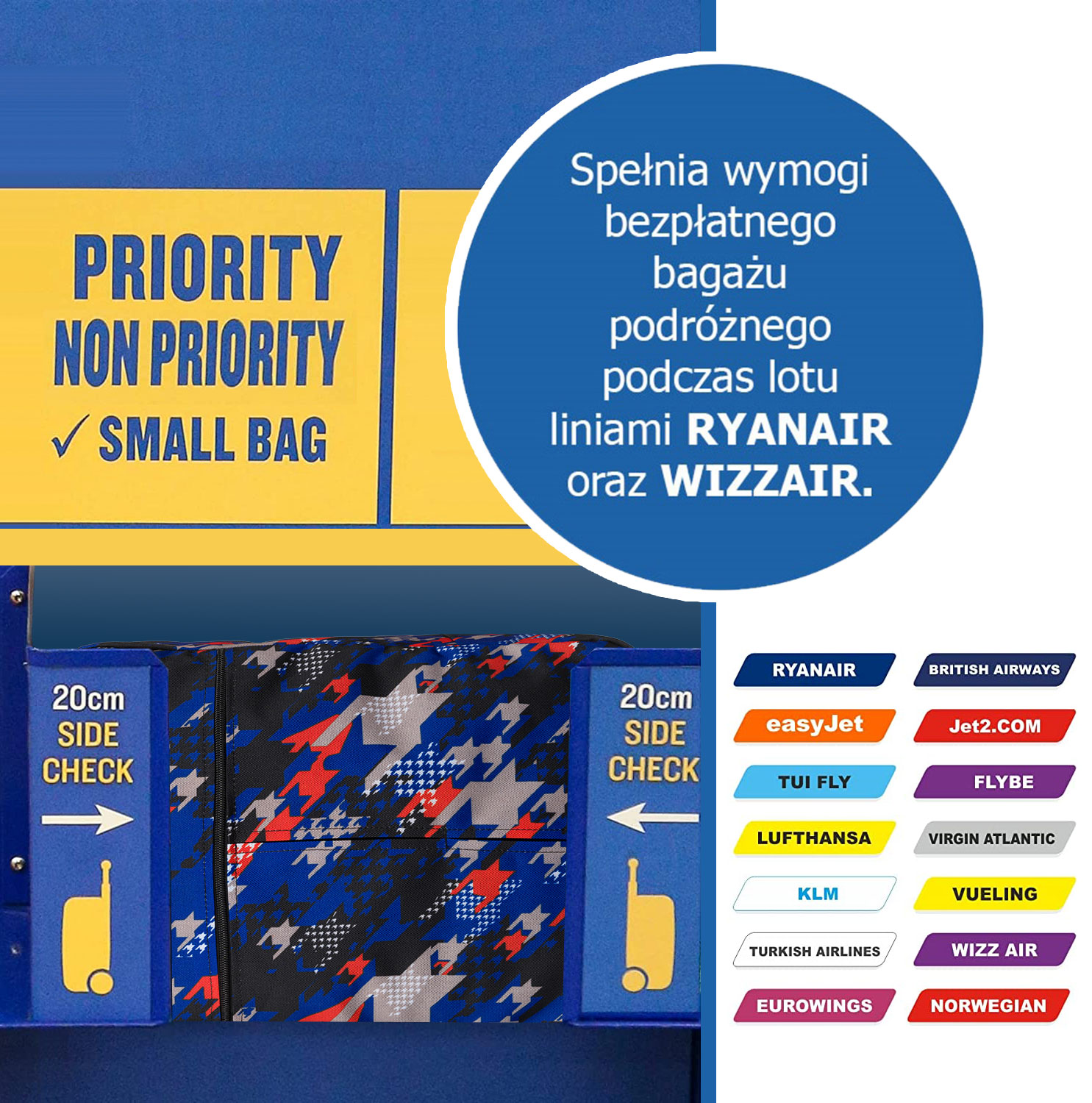 #️⃣ Največje dimenzije brezplačne majhne ročne prtljage na Ryanair – 40 × 25 × 20 cm, brez omejitve teže (mora se prilegati pod sedež spredaj)