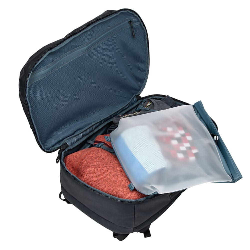 Thule Aion Travel nahrbtnik je odličen sopotnik za aktiven življenjski slog. Odlikuje ga izjemna kvaliteta, prostornost, vsestranska uporabnost, vzdržljivost in široko odpiranje. Nahrbtnik je primeren za večdnevna potovanja in izlete. Notranjost je odlično zasnovana, saj omogoča ločevanje vsakodnevnih predmetov od športne opreme ali oblačil. Zadnji del torbe se popolnoma odpre kot kovček, za enostavnejše pakiranje. V notranjosti je tudi zložljiva pregrada s TPU podlogo, ki preprečuje, da bi se vlaga s športnih/mokrih oblačil razširila po torbi. Nahrbtnik ima tudi namenski prostor za shranjevanje prenosnika, tablice in ostalih elektronskih pripomočkov. Zunanjost nahrbtnika ima vodoodporen premaz, ki površino in vsebino ščiti pred vodo. Drsnike na zadrgi je mogoče za dodatno varnost zakleniti skupaj.