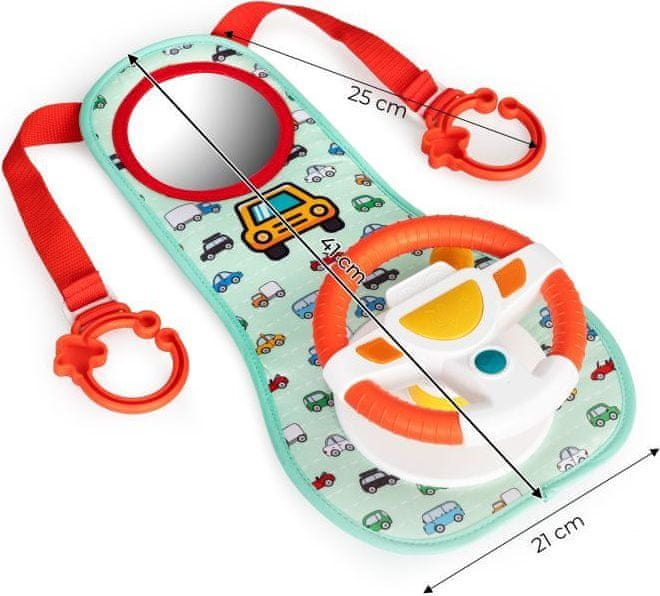 Popolnoma popestri potovanje vašega malčka in poskrbi za mirno vožnjo z avtomobilom vrtljiv volan in gumbi, ki ustvarjajo zvoke sirene in smernikov gumb za „zagon“ in zaklepanje avtomobila 10 veselih melodij okroglo ogledalo