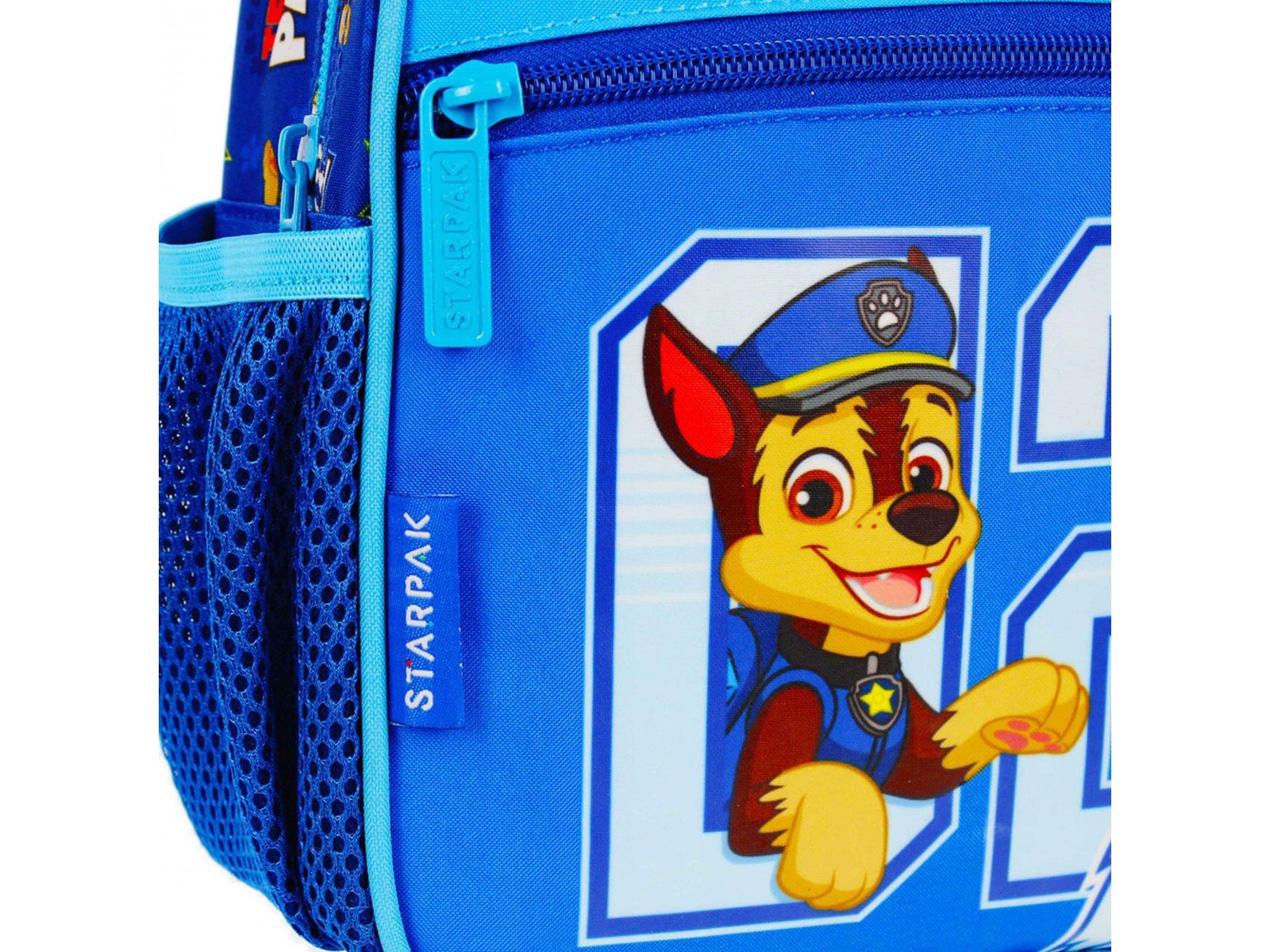 Moder nahrbtnik iz rahlo ojačanega materiala z natisnjenim likom Chase iz animirane serije „Tačka na patrulji“. Na zadnji strani so mehke, nastavljive naramnice, ki ščitijo ramena in hrbet pred prekomerno težo, zgoraj pa ročaj. Na eni strani je odprt mrežast žep, npr. za najljubšo pijačo, ter odsevn Celoten opis