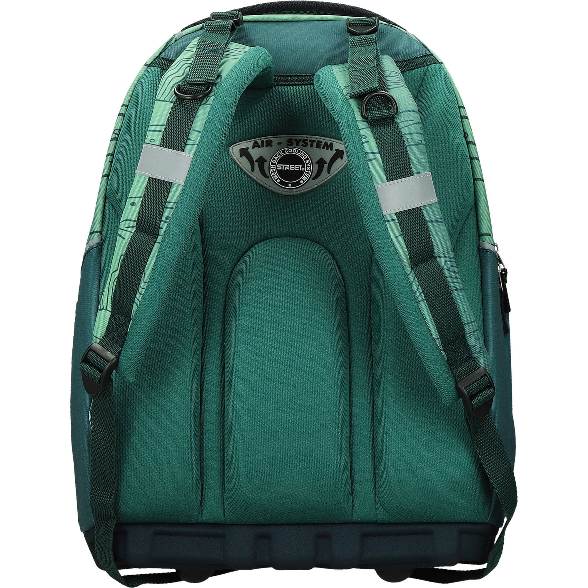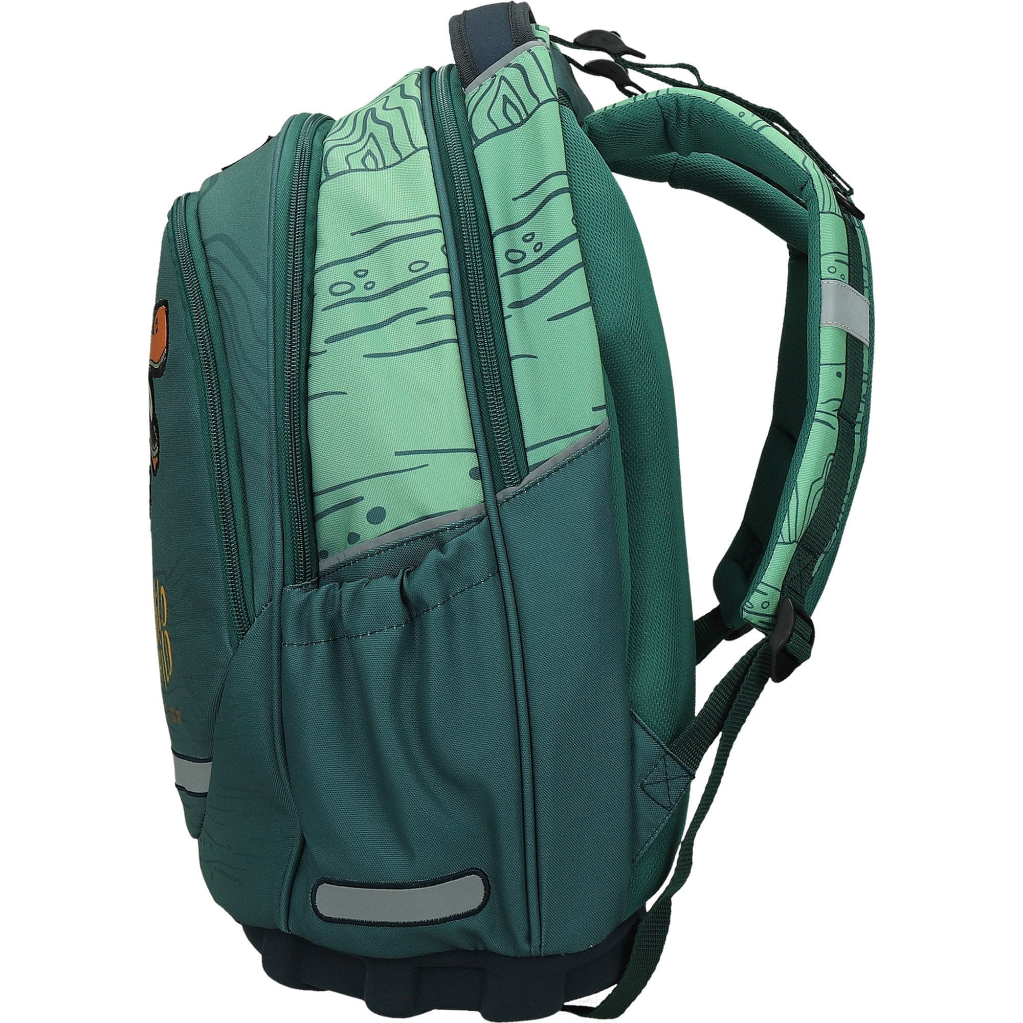 Ergonomsko oblikovano hrbtišče. Izredno lahek. Večplastno trdo dno. Široke in čvrste naramnice. Odsevni deli na naramnicah ter na sprednjem delu torbe. Primeren za prve tri razrede osnovne šole. Dimenzije: 31×19×41 cm.