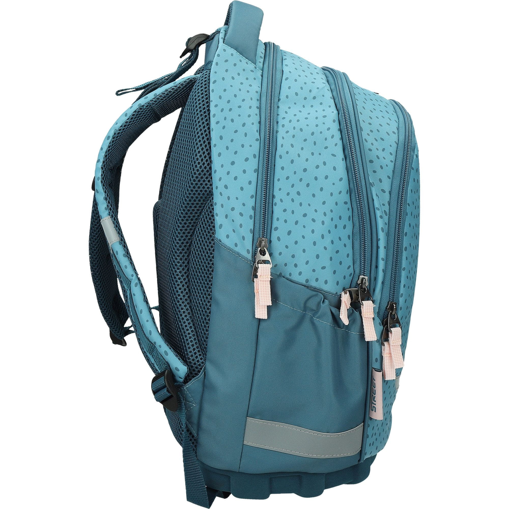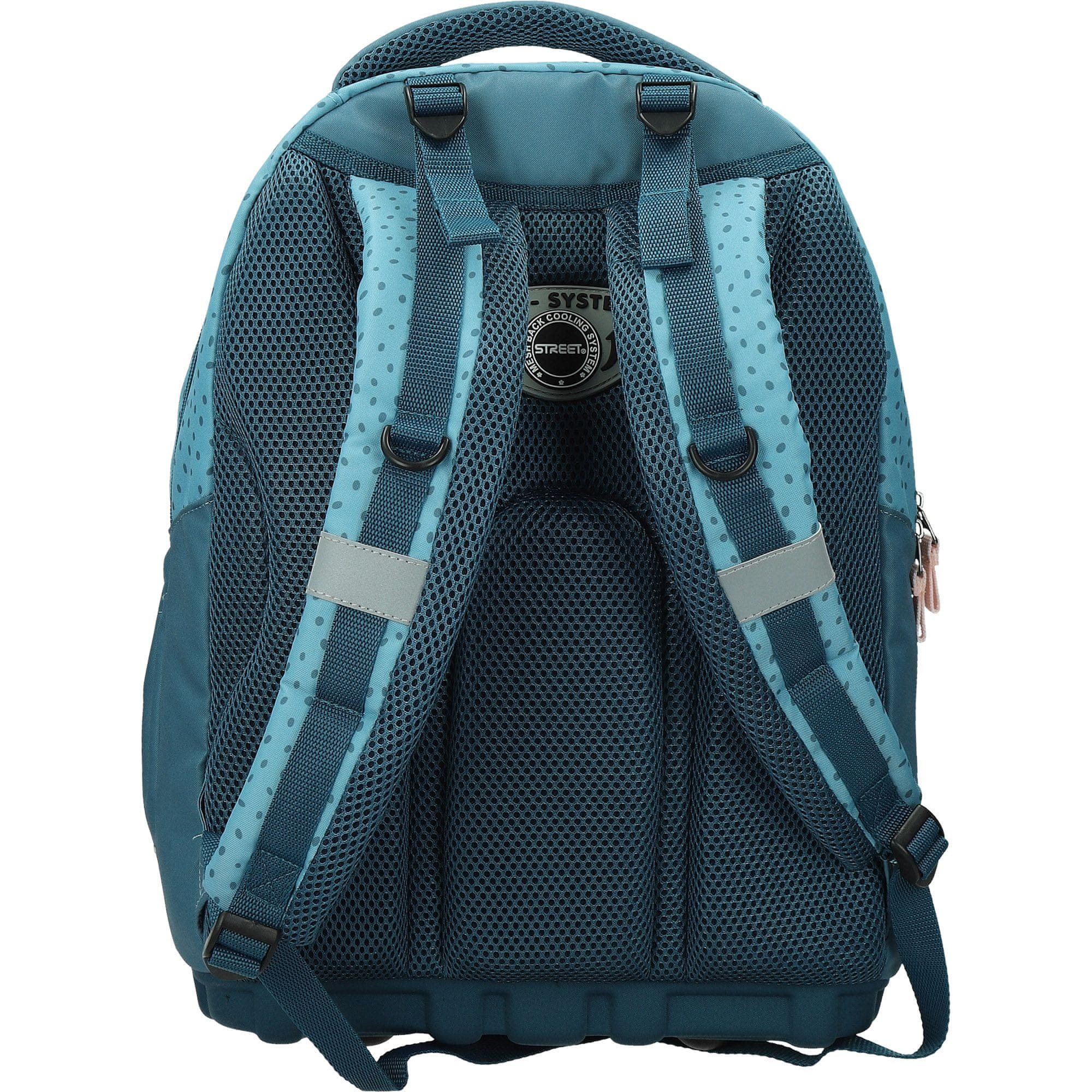 Ergonomsko oblikovano hrbtišče. Izredno lahek. Večplastno trdo dno. Široke in čvrste naramnice. Odsevni deli na naramnicah ter na sprednjem delu torbe. Primeren za prve tri razrede osnovne šole. Dimenzije: 31×19×41 cm.