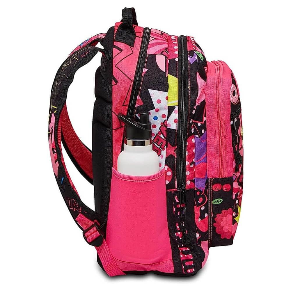 Značilnosti nahrbtnika so odlična zmogljivost zaradi treh ločenih predelov, ki omogočajo učinkovito shranjevanje in ločevanje tako osebnih predmetov kot šolskih potrebščin. Prvi, ki je največji je v neposrednem stiku s hrbtom, za prenos težjih knjig in slovarjev. Drugi je namenjen zvezkom in učbenikom, tretji, ki je najmanjši predel pa je namenjen za razne osebne predmete. Oblazinjenje po celotnem hrbtnem delu vam zagotavlja maksimalno udobje. Globoki prednji žep je zaprt z zadrgo Mitama MegaZip, gre za debelejšo zadrgo, ki je tudi bolj kvalitetna. Primeren je za osebne predmete kot so dnevniki, svinčniki, pametni telefon in prigrizki. Ramenski trakovi so široki in s tem preprečijo bolečine v hrbtu tudi pri zelo težkih obremenitvah. Vodoodporna tkanina zagotavlja nepropustnost in zaščito vsebine nahrbtnika. Tkanina je lahka in hkrati močna zaradi neuničljivih šivov. Celoten nahrbtnik je zasnovan ergonomsko, to pomeni, da se popolnoma prilega vašemu hrbtu in skrbi, da tudi ob večjem naporu ne prihaja do bolečin. Za to pa skrbi še posebno oblazinjenje Flexifoam na naramnicah, da je nošnja tega nahrbtnika kar se da udobna. Stranski žepi so narejeni iz elastičnega in nepremočljivega materiala, primernega za shranjevanje dežnikov in steklenic. Da pa se nahrbtnik ne bo uničil, je njegovo dno ojačano s posebno peno, ki mu zagotavlja samostoječ položaj, kar pa varuje tudi vsebino v njemu. Celoten nahrbtnik je v črni barvi, a vključuje različne motive v roza barvi, ki odlično navdihnejo izgleda samega nahrbtnika.