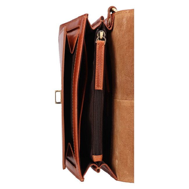 Opomba Moška usnjena torba, rjava, kovček s ključavnico, z zanko, 2 žepa na zadrgo, predal za dokumente, predal za mobilni telefon. Celoten opis