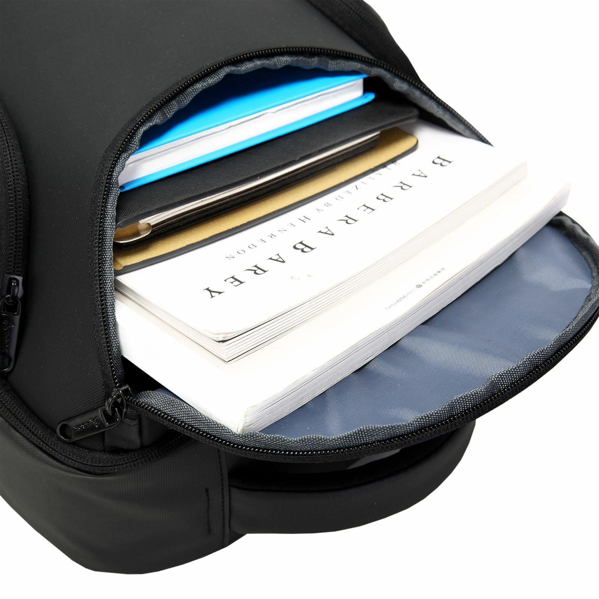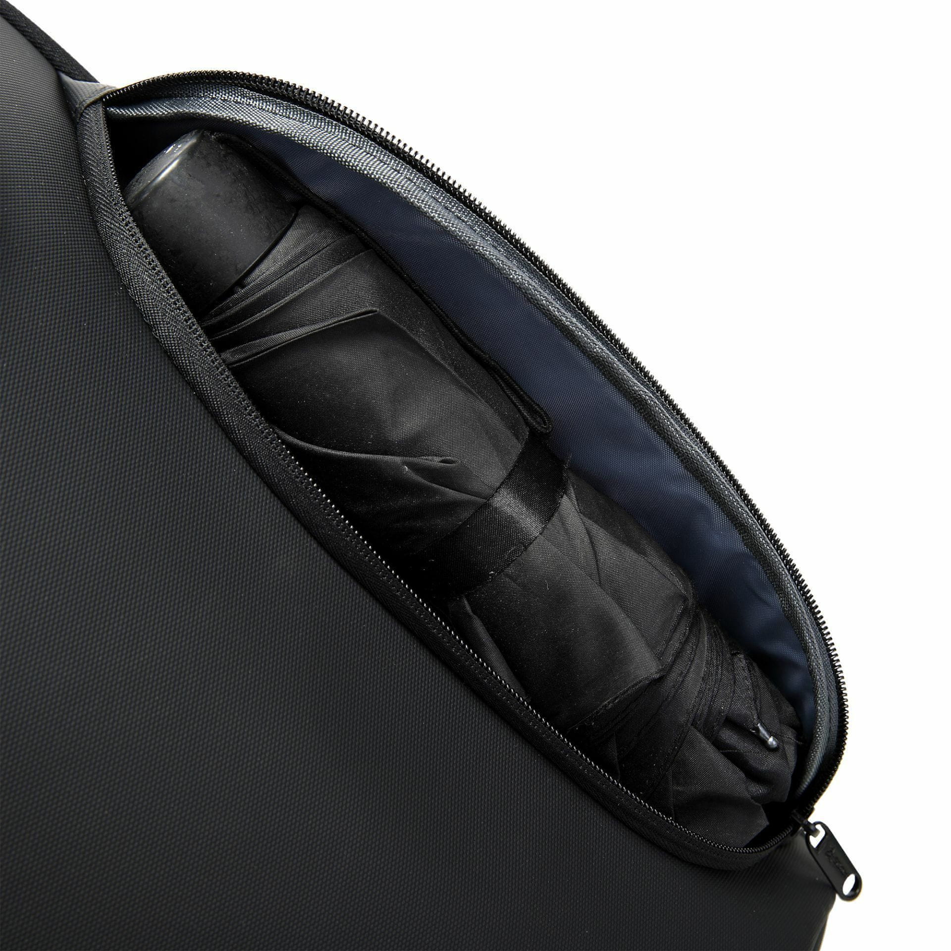Nahrbtnik je zasnovan za prenosnike do 15.6 palca in vključuje glavni predal, ločen žep za prenosnik ter več manjših prostorov za dodatke. Poseben zaprt predal omogoča shranjevanje dežnika, stranski USB priključek pa povezavo s powerbankom za polnjenje naprav med gibanjem. Material iz 210D poliestra je vodoodporen in se čisti z vlažno krpo.
