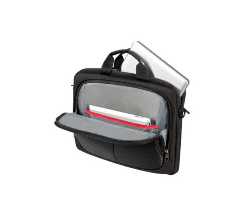 tanjša različica torbe vodoodporna Predal za prenosni računalnik: 39,6 cm / 15,6" ( 37,5 × 25,9 × 2,8 cm) Predal za tablični računalnik: 26,7 cm / 10,5" (26,6 × 18,3 × 1,5 cm) žep z zadrgo na sprednji strani odstranljiv nastavljiv naramni trak pametni rokav – tako imenovani trak za enostavno pritrditev na ročaj kovčka organizator velikost: 40 × 30 × 6 cm prostornina: 11 l teža 0,4 kg 2 leti garancije