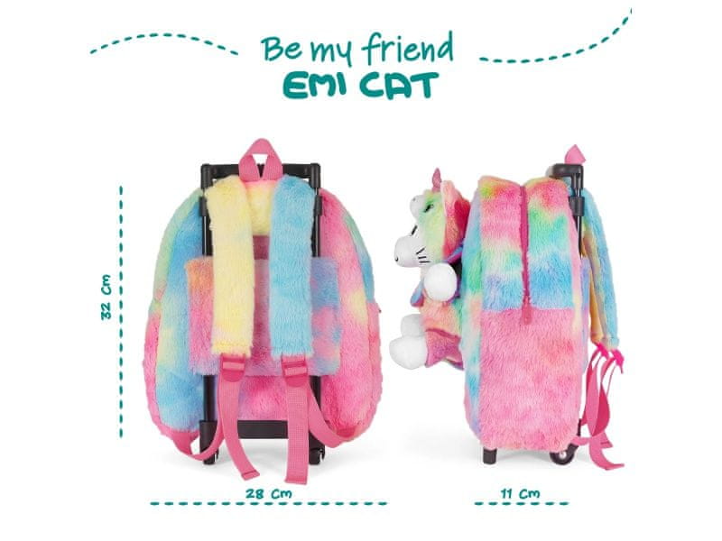 Nahrbtnik vključuje snemljivo plišasto igračo – mucko s klobukom samoroga, ki jo lahko preprosto odstranite in uporabite ločeno kot igračo. Plišasta žival je mehka, prijetna na otip in bo postala najljubši prijatelj vsakega otroka.