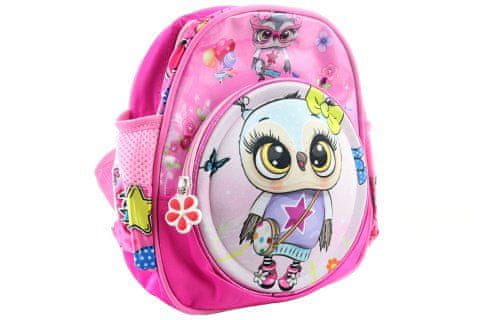 Tkaninski nahrbtnik s sovico. Sprednja stran je oblikovana. Nahrbtnik nima prsnega traku. Zapakiran je v vrečko. Dimenzije nahrbtnika 22×25×8 cm. Izdelek ni igrača.
