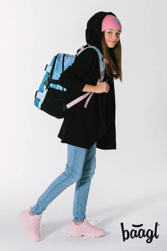 - Ergonomski šolski nahrbtnik s tremi samozapiralnimi predali z notranjim organizatorjem in žepom za 15-palčni prenosni računalnik ali tablični računalnik.