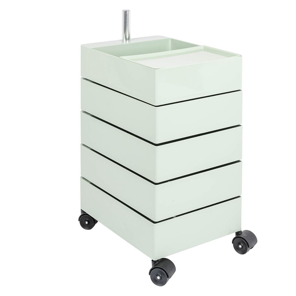 Škatla Cupbo 360. oblikovalska in praktična omara s petimi vrtljivimi predali, ki jih je mogoče preprosto odpreti. Izdelan je iz trpežne plastike ABS v intenzivni mint barvi. Zaradi svoje zasnove je vsak predal lahko dostopen. Cupbo 360 je opremljen s štirimi kolesi, kar povečuje njegovo uporabnost. Celoten opis