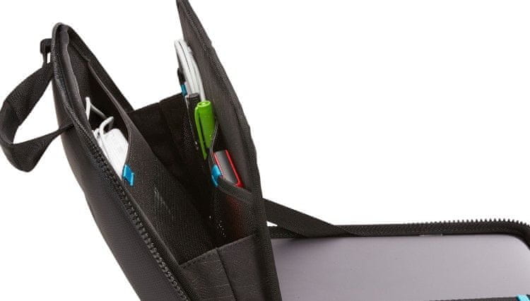 Thule torba ustreza modelom MacBook Pro z diagonalo 40,64 in 38,1 cm (16'' in 15''). Torbo lahko uporabljate tudi z drugimi prenosniki, v velikostih do 35,8 × 24,6 cm. Zasnovana je varovanje naprave z rigidno zasnovo in utrjenimi robovi. Nudi dodaten predal za polnilnik, dokumente in druge pripomočke. Njena unikatna zasnova na preklop omogoča, da uporabljate prenosnik kar v torbi. Omogoča nošenje z ročaji ali odstranljivo naramnico.