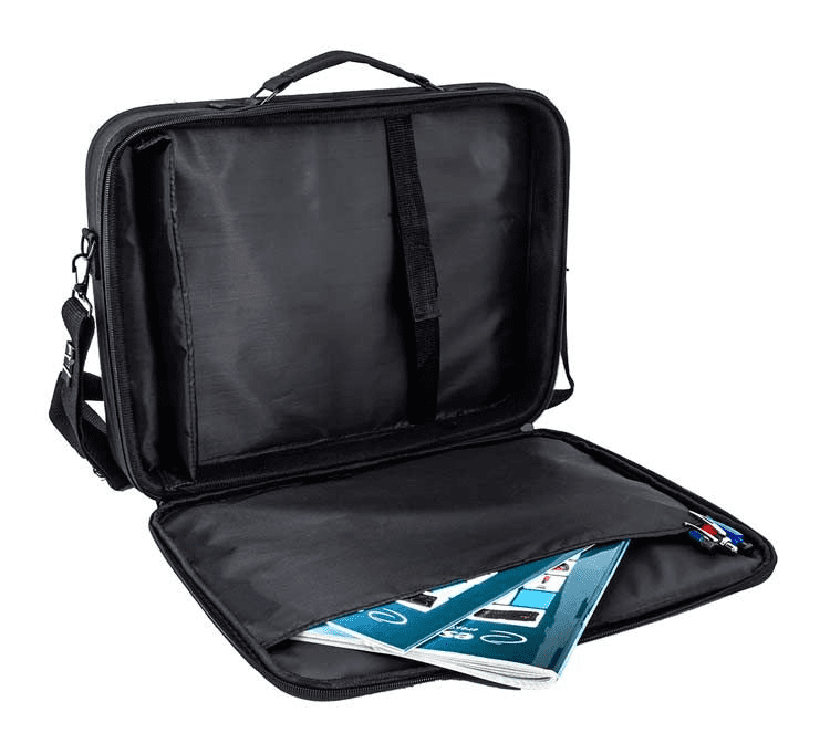 Elegantna torba za prenosnike z oprijetimi maks. 15.6 „. Velikost notranje komore se prilagodi z drsnim trakom z Velcro pritrditvijo, kar omogoča prilagajanje komore dimenzijam prenosnika. Torba je narejena iz visoko kakovostnega materiala. Stranske stene so ojačane s kovino na notranji strani obložene z mehko plastjo pene, ki prenosni računalnik ščiti pred udarci in praskami. Predel za prenosni računalnik na vsaki strani je obložen z mehkimi materiali. Zunaj – spredaj – ima torba funkcionalen žep primer za dokumente. V notranjosti torbe je drugi žep za priročne dokumente in pas, ki dodatno nosi prenosni računalnik. Kovinski tečaji ročaja in naramnice zagotavljajo visoko vzdržljivost in zanesljivost. Nastavljiv naramni trak je pritrjen z zelo praktično kovino kljuke, v svojem osrednjem delu pa ima jermen gumijast pokrovček, ki poveča udobje pri nošenju. – Torba za prenosnike velokosti 15,6“