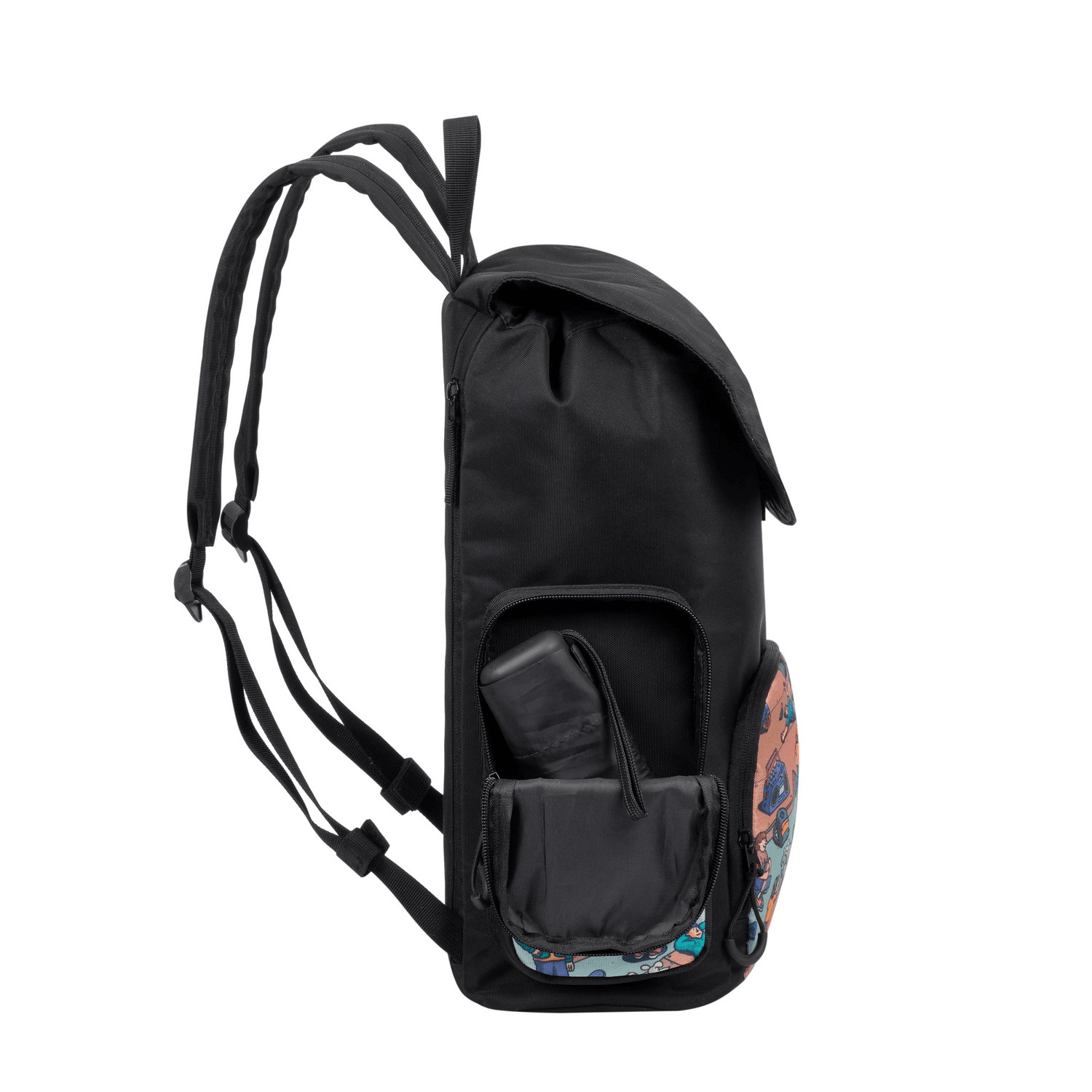Velik glavni predal je dovolj prostoren, da vanj lahko posprvite vse potrebščine. V sprdenjem delu je žep na zadrgo, kjer je prirčen prostor za pisalo, blok, knjigo, telefon. V tem predalu je vgrajen nosilec za ključe, tako da bodo vedno na varnem in pripeti. Obešalo za kluče se lahko s pomočjo zaponke odpne. Nahrbtnik ima tudi stranska predala, kamor se lahko odloži še nekaj drobnarij ali flaška, da bo hidracija čez dan popolna. Ima pa tudi skriti predal za bolj dragocene stvari.