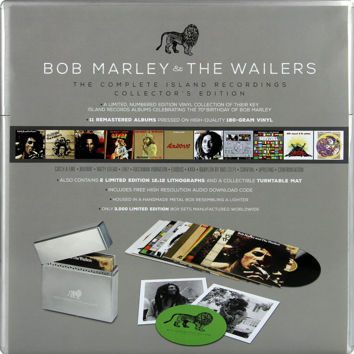 Ta zbirka vsebuje devet studijskih albumov od Catch A Fire do Confrontation, posnetih za Island Records, in dve izdaji v živo, vključno z 2LP Babylon By Bus, vsi natisnjeni na 180-gramskem vinilu. Shranjeni v kovinski škatli, oštevilčeni in podloženi z žametom. Ta različica je opremljena tudi s podlogo ob 70. obletnici in dvema fotografijama.