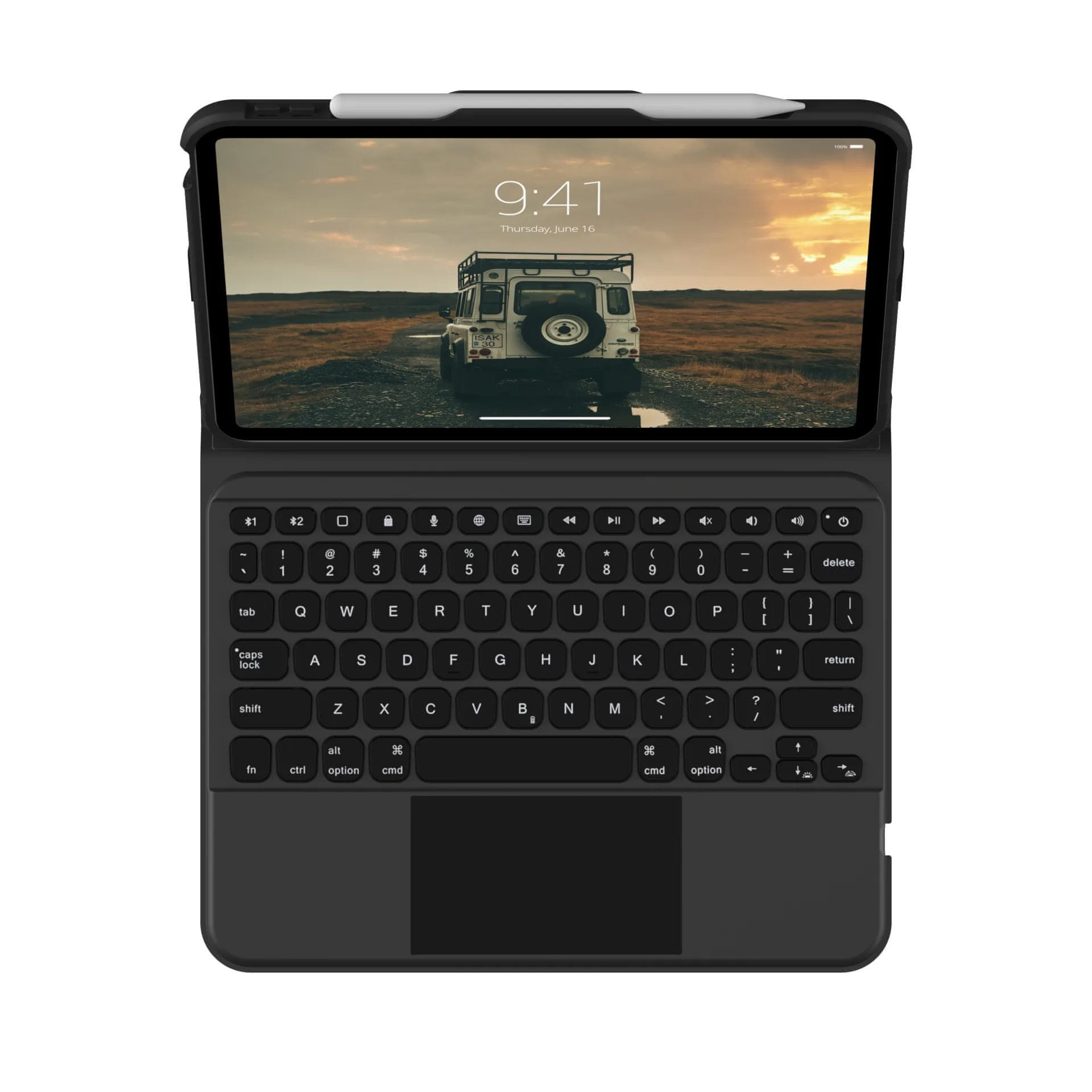 • UAG Robustna tipkovnica Bluetooth s sledilno ploščico ima trpežno nedrsečo zunanjo površino in druge vrhunske lastnosti, ki predstavljajo UAG-ovo zavezanost zaščiti. S povezljivostjo Bluetooth ponuja robustna tipkovnica Rugged Keyboard vrhunsko izkušnjo tipkanja in sledenja v slogu prenosnega računalnika. Opremljena je s tipkovnico, ki je odporna na razlitje, in priročno nameščenimi osvetljenimi tipkami. Izjemno velika sledilna ploščica za več dotikov s podporo za geste. Izkušnja, podobna prenosnemu računalniku, z nastavljivim magnetnim stojalom, ki ponuja štiri načine prikaza, s katerimi lahko tipkate, gledate, rišete ali berete. Dolgotrajna polnilna baterija, ki omogoča do 6 mesecev delovanja (odvisno od uporabe). Vrhunski zunanji taktični ročaj zagotavlja varno rokovanje. Prostor za shranjevanje svinčnika Apple Pencil, tako da ga lahko imate vedno pri roki. Z vzdržljivo tipkovnico Bluetooth in odstranljivim ohišjem UAG lahko delate kjerkoli.