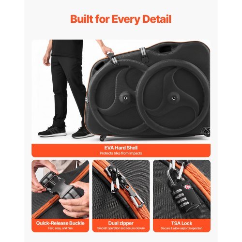 Ta potovalna torba za kolo je zasnovana za kolesarje ki potrebujejo varno in priročno prevažanje svojih cestnih koles velikosti 700C. Z ohišjem iz trdega EVA materiala in celovito zaščito zagotavlja da so vaše kolo in njegove sestavne dele zaščiteni pred udarci in poškodbami med potovanjem. S kolesi za enostavno premikanje oblazinjenim ročajem in TSA odobreno ključavnico ta torba omogoča brezskrbno premikanje po letališčih in postajah ter zagotavlja miren potek vsake poti.