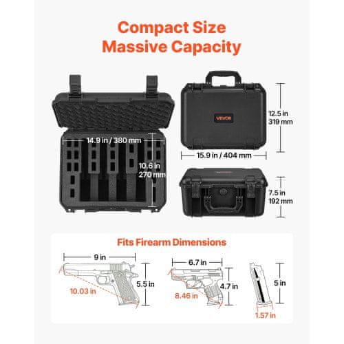 Ta robusten trdi etui za pištolo nudi varno vodoodporno shranjevanje za orožje in opremo z nastavljivo penasto notranjostjo ter priročnim ročajem. Ustreza TSA zahtevam za potovanja. Dimenzije: 404×319×192 mm. Celoten opis