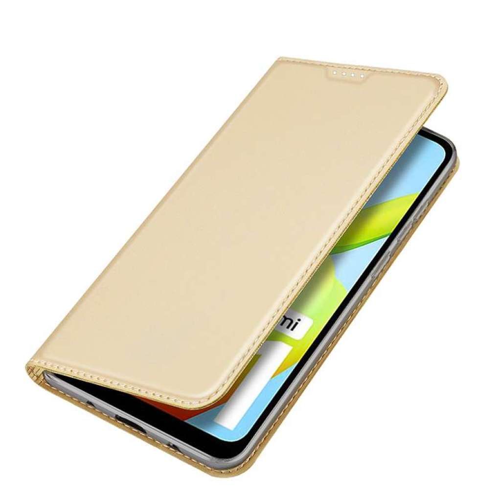 Preklopni ovitek za Redmi A1/A2 zlata – Zaščita zaslona pred praskami, Vgrajeno stojalo, Reža za kreditne kartice, Magnetno zapiranje. Celoten opis