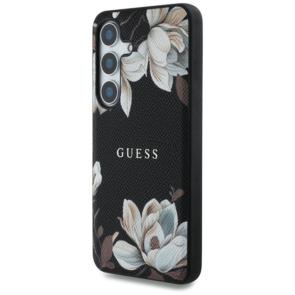 Originalni GUESS ovitek za Samsung Galaxy S25 5G – MagSafe – Printed Flower – črn – GUHMS25SPGNMPLMK