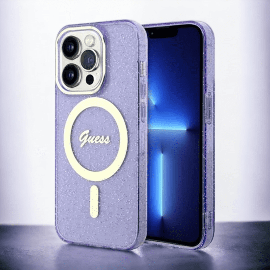 Guess Ovitek Guess "Purple - Gold Glitter" za iPhone 14 Pro s tehologijo MagSafe (GUHMP14LHCMCGU)