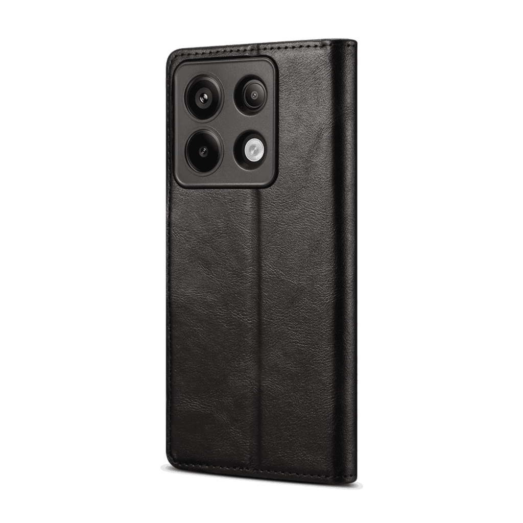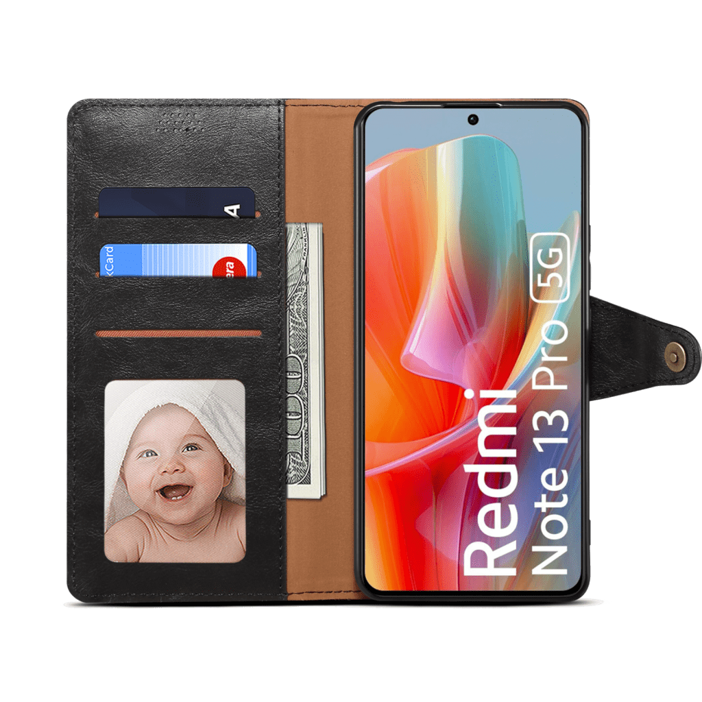 Usnjen preklopni ovitek za Redmi Note 13 Pro 5G črna – Zaščita zaslona pred praskami, Integrirano stojalo, Reža za kreditne kartice, Magnetno zapiranje. Celoten opis