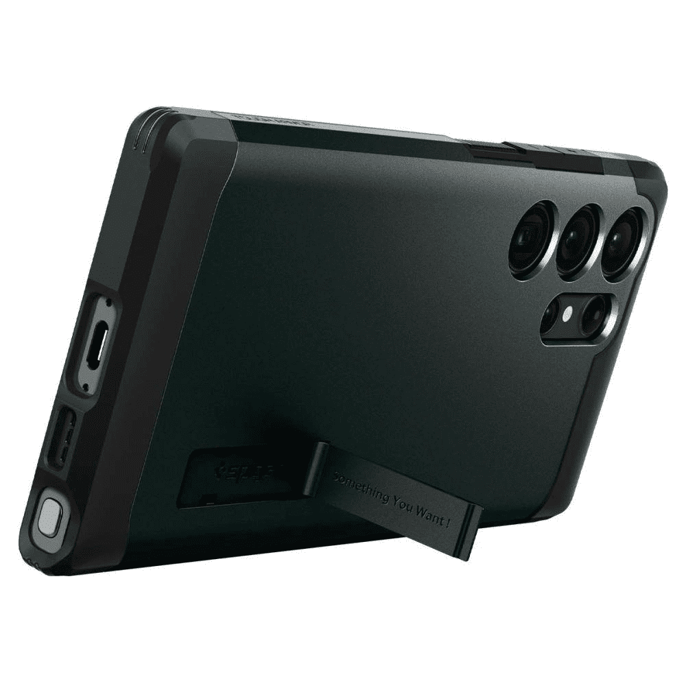Ohišje iz Spigenove serije Tough Armor je nova naslovnica podjetja. Njegova dvodelna struktura je izdelana iz termoplasta, odpornega proti obrabi, in ojačevalnega polikarbonatnega okvirja. Notranja stran ovitka je polnjena s tehnološko peno, ki zagotavlja dodatno plast zaščite pred udarci ali padci naprave. Torbica je opremljena z nogo, ki omogoča enostaven pregled nad dogajanjem na zaslonu telefona, ne da bi ga morali držati. Etui se popolnoma prilega in ne omejuje možnosti brezžičnega polnjenja.Rahlo privzdignjena oblika ovitka okoli kamere in zaslona ju ščiti pred praskami, dvigne telefon tik nad ravno površino.Ima gumb pokrovi in izrezi za vrata. Tough Armorje kovček, ki je bil 26-krat podvržen preizkusom padcev z višine do 1,2 m in tako prejel ameriški vojaški certifikat MIL-STD 810G-516.6.