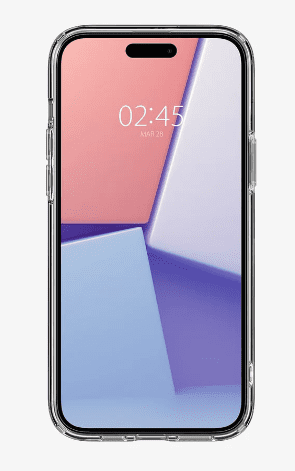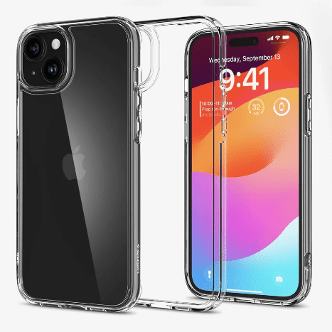 Spigen Ultra Hybrid ovitek za iPhone 15, v prozorni barvi. Izdelan iz mešanice PC in TPU za vzdržljivost. Dvignjeni robovi za zaščito zaslona in kamere. Združljivo z brezžičnim polnjenjem.