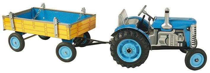 Rdeč traktor Zetor z valjarjem podjetja Kovap. Gibanje traktorja je zagotovljeno z edinstvenim vzmetnim strojem, ki se vleče s ključem. Funkcionalni menjalnik ima tri hitrosti za vožnjo naprej in vzvratno vožnjo. Traktor je dejansko mogoče krmiliti z volanom in tudi zavirati z ročno zavoro. Merilo 1:25. Dimenzije paketa 30 × 9 × 9 cm. Primerno za otroke od 3. leta starosti dalje.