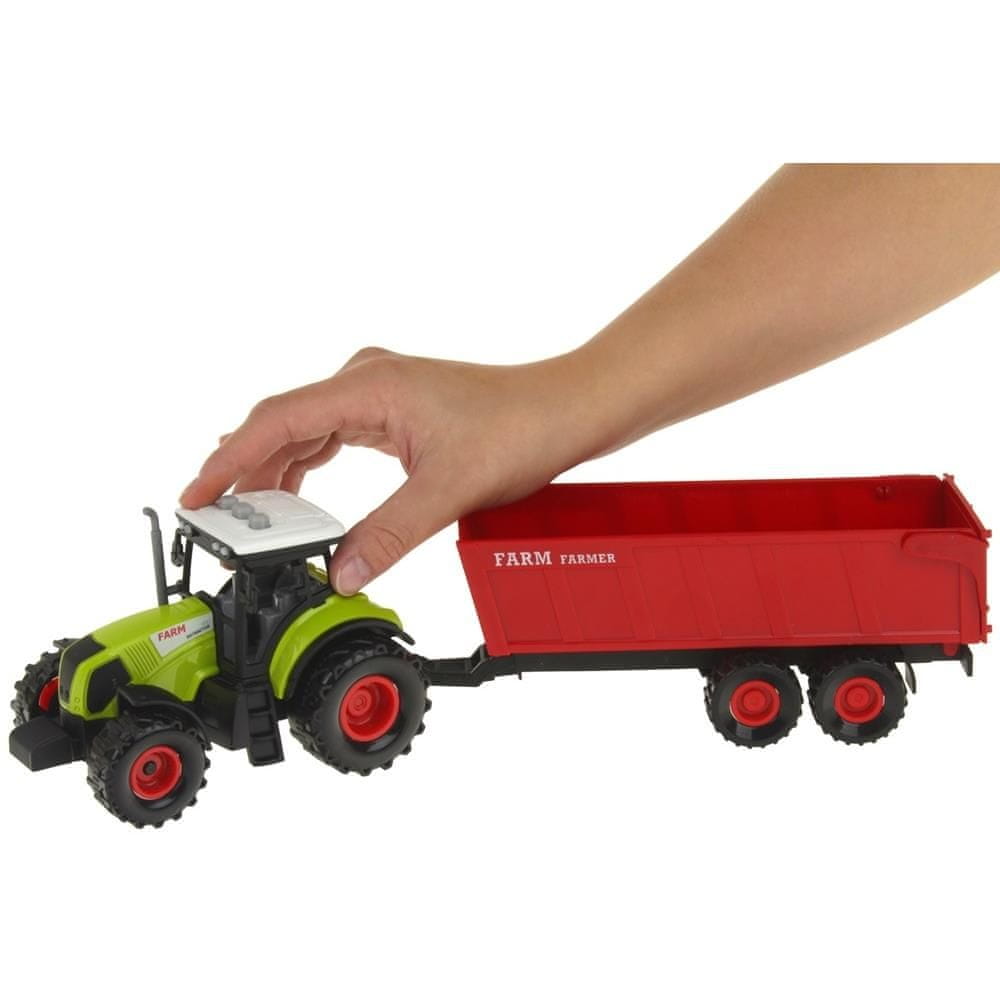 Traktor s tornim pogonom na zadnji osi, zvočnimi in svetlobnimi efekti ter snemljivo prikolico. Zvočni učinki, ki dajejo prednost igrači, ustrezajo zvokom plina, zagona motorja in vzvratne vožnje. Za svetlobne učinke skrbijo luči, nameščene spredaj, pod streho vozila, ki utripajo ob vklopljenem zvoku. Dvižna prikolica v obliki zabojnika z dvižno zadnjo loputo, popolna za prevoz sipkih materialov, kot sta žito ali pesek. Realno odslikana vas bo spodbudila k igri in vašemu otroku omogočila veliko zabave.