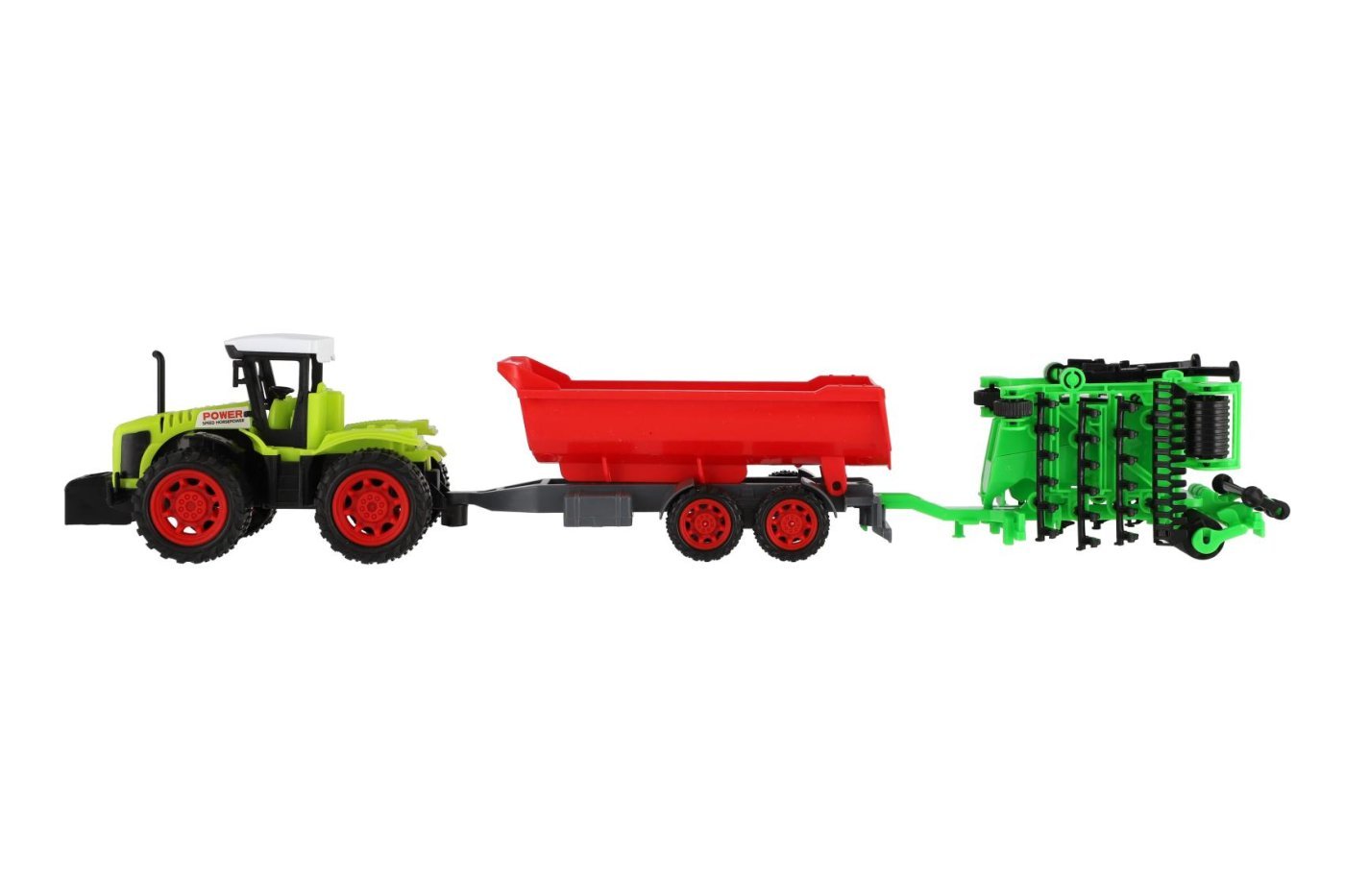 Traktor z vleko in brane so za vsakega malega kmeta nepogrešljivo in vsestransko orodje. Traktor je na vztrajniku. Dimenzije paketa 10 × 12 × 59 cm. Primerno za otroke od 3. leta dalje.