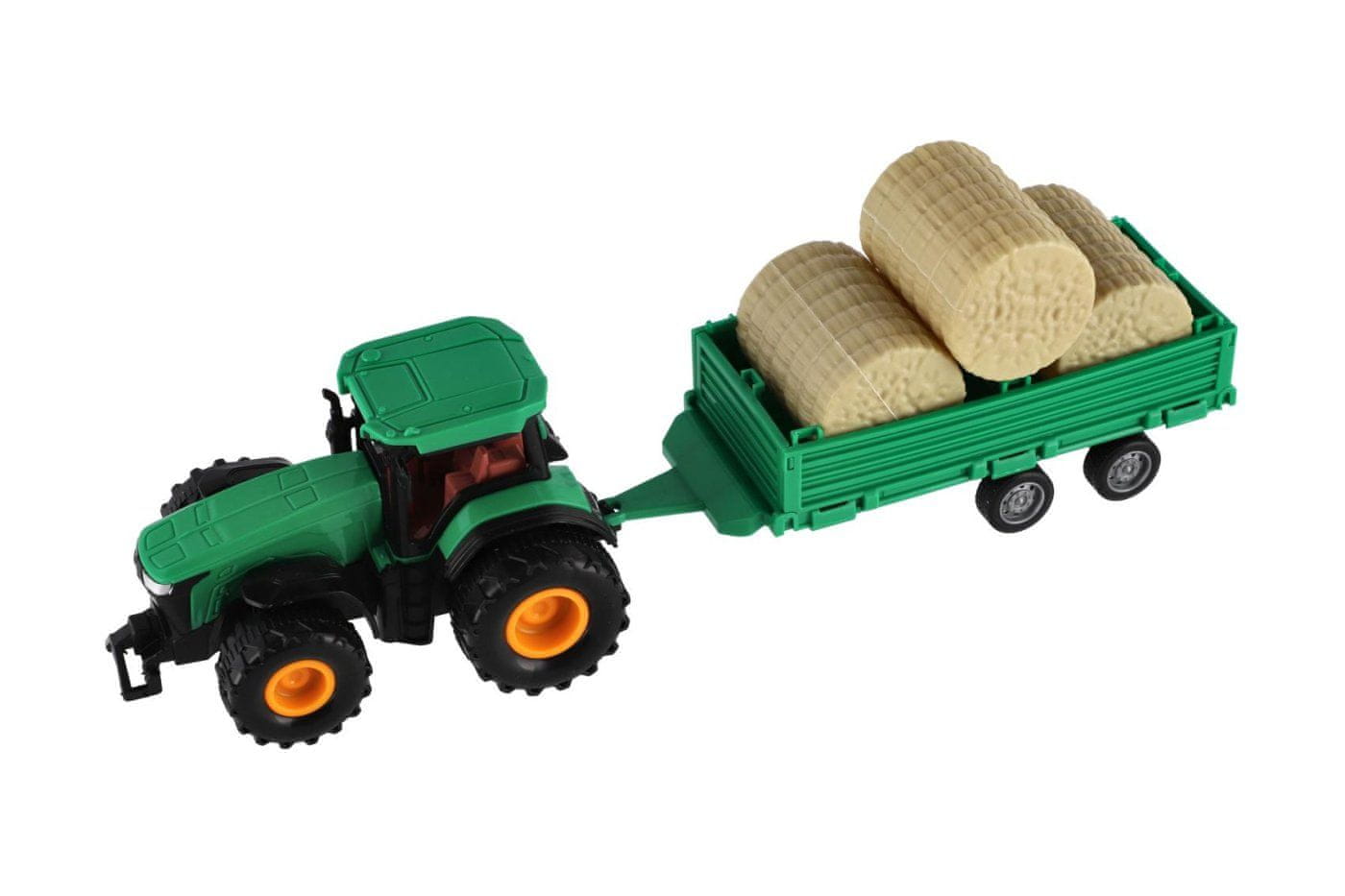 Traktor s prikolico je za vsakega malega kmeta nepogrešljiv in vsestranski pomočnik. Traktor je na vztrajniku in je velik 30 cm. Neskončno delo na kmetiji se lahko začne. Vleko za bale je mogoče odklopiti. Dimenzije paketa 33 × 12 × 9 cm. Primeren za otroke od 3. leta starosti.