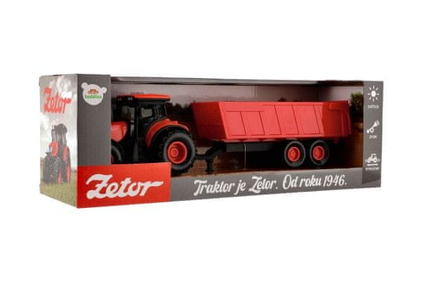 Krasen model kmetijskega traktorja Zetor z dolgoletno tradicijo, ki mora biti všeč vsakomur. Odpravite se na polja s pravim traktorjem s svetlobo in zvokom! Traktor z valjarjem je nepogrešljiv pomočnik vsakega malega kmeta! Valj lahko preprosto odklopite in traktor uporabite za druga dela. Traktor deluje na vztrajnik. Pritisnite na gumbe in traktor bo izdal realistične zvoke in se prižgal. Igračo poganjajo 3× baterije AG13, ki so priložene. Velikost traktorja z valjem: 36 cm Velikost škatle: 39×13×13 cm Primerno za otroke od 3. leta starosti