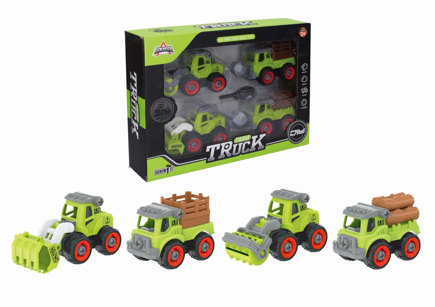 Auto vijak kmetijski 4 kosi. Velikost 13 cm. Brezplačna kolesa. V paketu – 4 avtomobili, tovor, izvijač.
