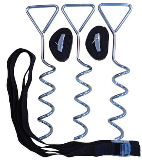 Komplet za sidranje trampolina je namenjen vsem okroglim ali pravokotnim trampolinom. Ima dve glavni funkciji – omogoča premikanje trampolina, ne da bi spodnji del nog izpadel, in pomaga pri sidranju trampolina v tla s pomočjo sidrnih kavljev. S tem se prepreči možnost poškodbe trampolina, če ga prevrne močan veter ali ga celo poškodujejo drugi leteči predmeti. To je univerzalni komplet za vse velikosti trampolinov. Dolžina pritrdilnega kavlja je 31 cm. Dolžina dela traku, ki se pritrdi na trampolin, je 156 cm (trak se lahko prepolovi). Del traku, ki se pritrdi na kavelj za sidranje, meri 45 cm ( prav tako se lahko prepogne na pol ) – vsebina paketa – 3 trakovi s karabini – 3 kavlji za sidranje (vrtanje) Za velike trampoline s premerom od 366 cm priporočamo nakup 2 kompletov sider (skupaj 6 kosov), da bo trampolin enakomerno pritrjen po celotnem obodu. Le tako boste dosegli pravilno funkcijo sidranja.