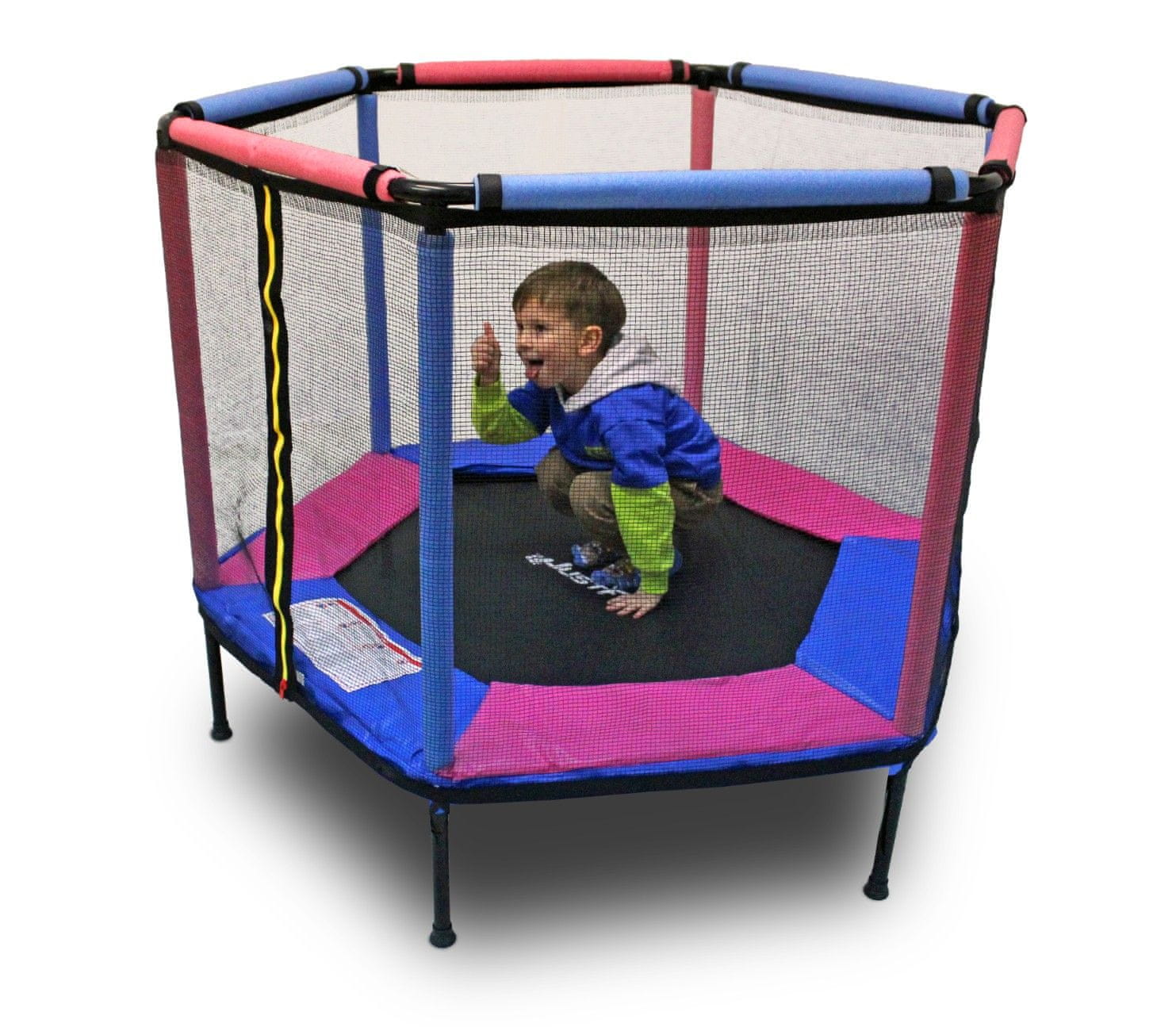 NOVOST!! TRAMPOLIN „PLAYPLAY“ 140 CM ZA DOM IN VRT VEČBARVEN JUSTFUN Novo!! Trampolin „Playpen“ 140 cm šesterokotni večbarven JustFun Zahvaljujoč trampolinu JustFun „Playpen“ se lahko zabavajo tudi najmanjši otroci! In po uspešni igri si lahko otrok malo zadrema :) Trampolin JUST FUN za otroke doma je zagotovilo za varnost in kakovost, kar je zaradi uporabe predvsem s strani otrok naša prednostna naloga pri prodaji. Varnost in kakovost sta vključeni v naslednje lastnosti naših trampolinov: ojačana krožna cev, ki je osnova trampolina Zakaj trampolin? To je odličen način, da otroke odvrnete od televizije, pametnega telefona, tablice, konzole, prenosnika, računalnika. Predvsem pa gibanje in zabava. Fantastičen način za privlačnejše vadbe na prostem. Visokokakovostna podloga in vzmeti zmanjšujejo obremenitev sklepov. Zahvaljujoč skakanju na trampolinu boste enostavno in varno izboljšali svojo telesno pripravljenost in telesno pripravljenost svojih najdražjih. Še posebej boste izboljšali koordinacijo oči in rok ter vzdržljivostni krvni obtok, kurili boste kalorije, sproščali energijo, sprostili se boste. Želite razveseliti svoje najdražje. Ne odlašajte, naročite še danes. MAT: USA TECHNOLOGY ena najboljših na trgu vodoodporna odporna na raztezanje odporna na UV žarke pritrditev – guma z elastično kroglico. Elastična PE mreža: povečana odpornost proti UV-žarkom, dodatno pritrjena od spodaj, da prepreči padec vadbene naprave. Vhod na trampolin je zavarovan z zadrgo. Posebni plastični pokrovčki na nogah ščitijo tla pred praskami. Varnostna mreža pod trampolinom preprečuje vstop otroku. Med uporabo je strogo prepovedano zadrževanje pod trampolinom.