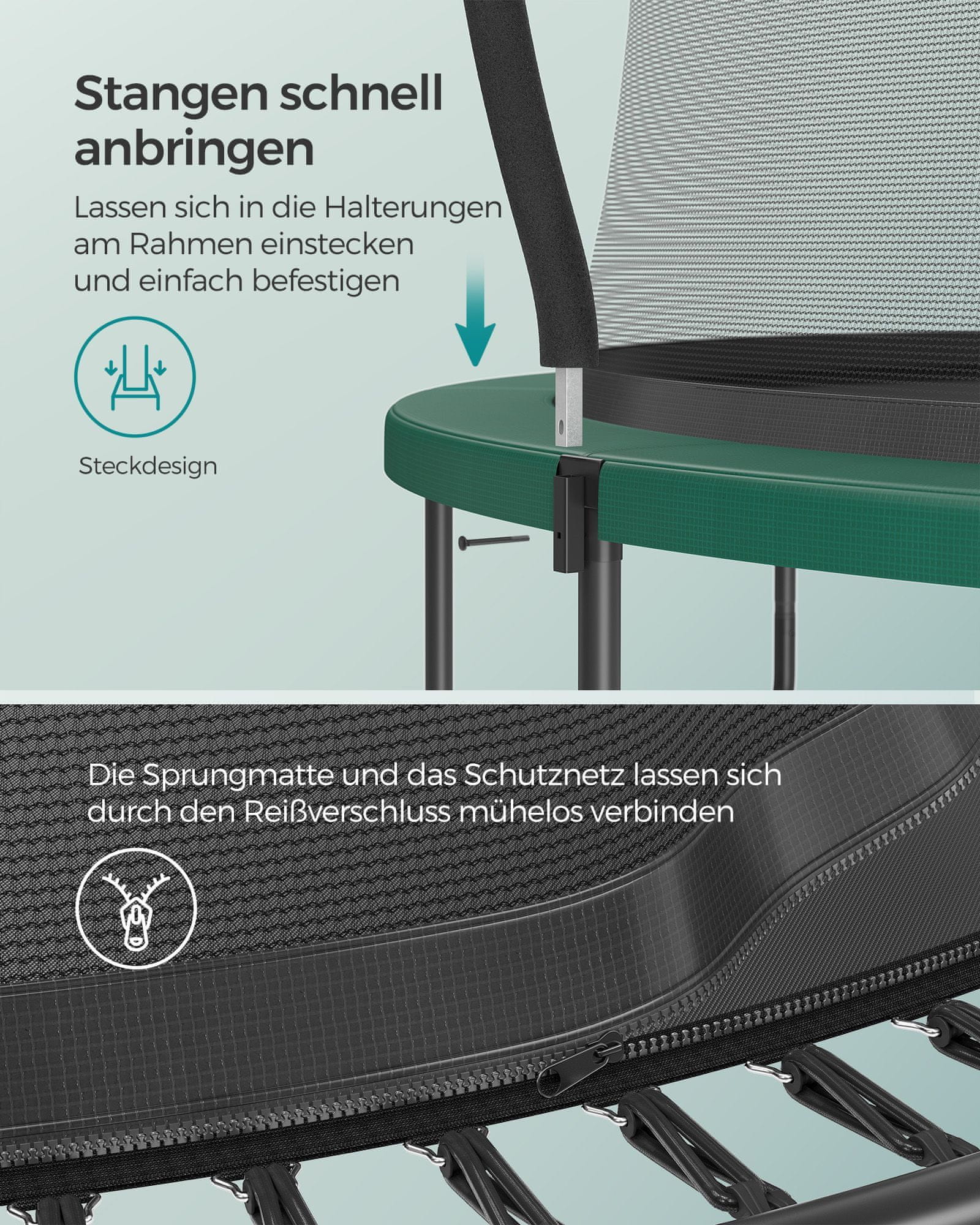 Ta zunanji trampolin je zasnovan tako da otrokom omogoča varno in prijetno izkušnjo skakanja. Namesto tradicionalnih vzmeti uporablja elastične vrvi kar zagotavlja tišjo uporabo in večjo varnost. Trampolin je opremljen z varnostno mrežo z zadrgo in trdnimi steklenimi stebri zaradi česar je primeren za družinske vrtove ali zunanje igralne površine.