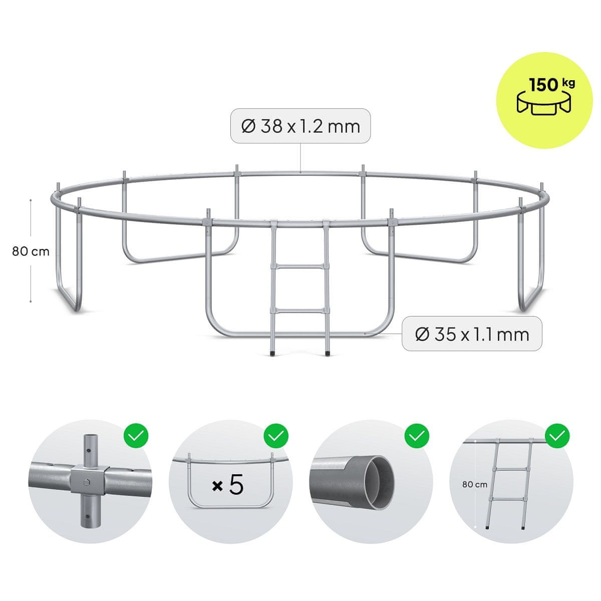 - Celoten komplet vključuje: trampolin, zaščitno mrežo, lestve