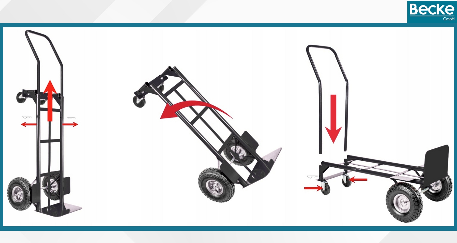 Voziček z nastavljivim ročajem in dodatnimi kolesi omogoča prevoz tovora tako v navpičnem položaju, na dveh kolesih kot samokolnica, kot tudi vodoravno, na štirih kolesih kot ploščad. To olajša prilagajanje vrsti blaga in terenu.