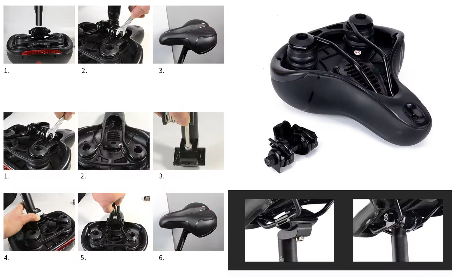 Sedež je opremljen z univerzalnim sistemom pritrjevanja, ki je združljiv z večino standardnih sedežnih opor za kolesa. Zahvaljujoč temu vam ni treba skrbeti za prileganje – naš sedež ustreza skoraj vsakemu kolesu, od mestnega do gorskega.
