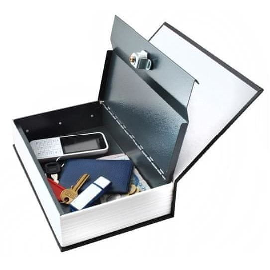 Sef v obliki knjige – varno shranjevanje dragocenosti, trezor za ključe. Notranje mere (dolžina / širina / debelina): 23 × 14,5 × 5 cm. Celoten opis