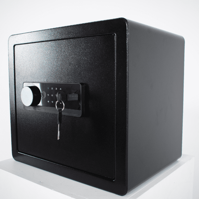 Nikcorp Biometrični sef na prstni odtis, kodo in ključ 36x40x30 cm | Domači jekleni trezor z alarmom in polico