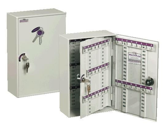 Specifikacija: Višina: 36 cm Širina: 23,5 cm Globina: 11 cm Barva: Siva (RAL 7035) Teža: 4,8 kg Število vrat: 1 Število držal za ključe: 86 Vrsta ključavnice: Cilindrična Garancijska doba: 2 leti Lastnosti izdelka: Varno shranjevanje ključi: Naša omarica za ključe zagotavlja varno mesto za shranjevanje do 86 kosov ključev, kar olajša njihovo organiziranje in nadzor. Vzdržljiva konstrukcija: izdelana iz 1,2 mm debele pločevine, je naša omarica trdna in vzdržljiva ter zagotavlja dolgoročno uporabo. . Odstranljiv predal s patentno ključavnico: z odstranitvijo predala se zmanjša število držal za ključe, poveča pa se prostor za ključe, vezane v velike šopke. Cilindrična ključavnica z dvema ključema: Omarica se zapira s cilindrično ključavnico, ki zagotavlja dodatno varnost. V kompletu sta dva ključa. Ekološka prašna barva: Omarica je barvana z ekološko sivo prašno barvo (RAL 7035), ki dodaja estetski videz in je odporna na obrabo. Vnaprej izvrtane montažne luknje: omarica je že opremljena z vnaprej izvrtanimi montažnimi luknjami, kar olajša montažo na pravo mesto. Oštevilčene, navpično nastavljive oznake: komplet vključuje oštevilčene oznake za ključe za enostavno identifikacijo. Obeski so navpično nastavljivi za še večjo prilagodljivost.