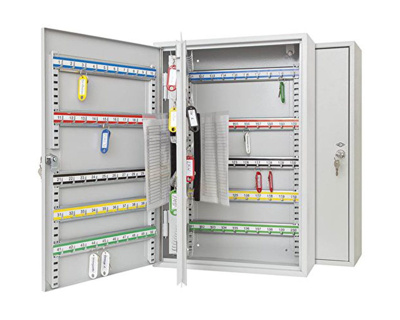 Omarica za ključe KB-200 je robustna omarica za ključe iz prašno lakiranega jekla z mat, neobčutljivo površino. Ima 200 kavljev za ključe, 1-krilna vrata in 1 vmesno steno, ki jo je mogoče sukati v levo in desno. Pripravljena je za pritrditev na steno, kavlji so označeni in oštevilčeni. Oba seznama, ki sta zaščitena v PVC srajčkah, je prav tako mogoče zasukati.