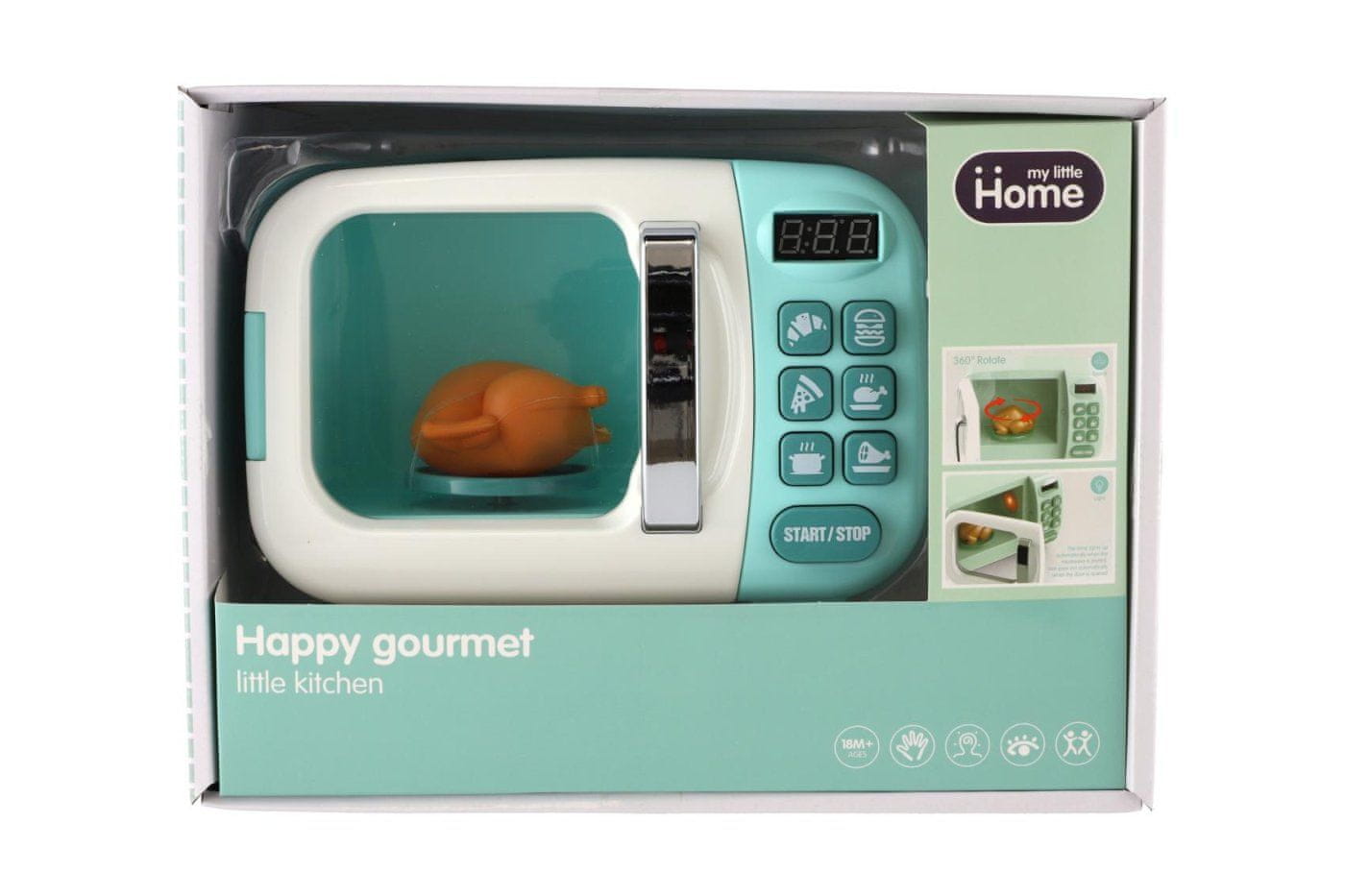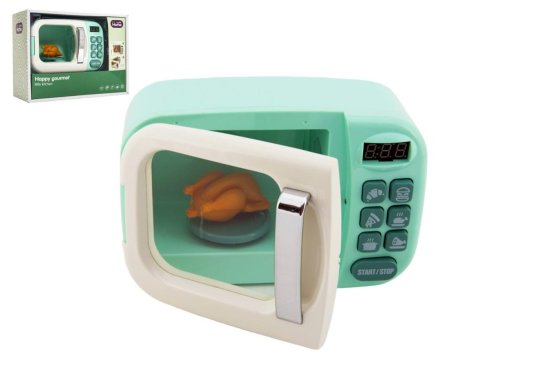 Mikrovalovna pečica ne sme manjkati v nobeni kuhinji malega kuharja. In to takšna, v kateri se piščanec v notranjosti vrti pri 360 °C, lučka pa se samodejno prižge, ko začnete segrevati, in ugasne, ko odprete vrata. Mikrovalovna pečica je izdelana iz visokokakovostne plastike in je opremljena s svetlobo in zvokom. Baterije 2× AA niso vključene. Dimenzije paketa 29 × 22 × 12 cm Primerno za otroke od 18. meseca dalje